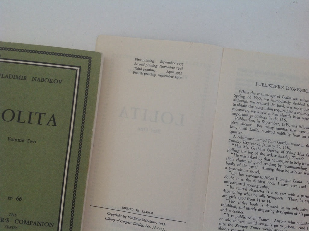 VLADIMIR NABOKOV. Lolita - Two Volumes - No 66 Traveller's Companion Series . Paris: Olympia Press, 1959. 176 x 11 x 28 Mm . Paperback....